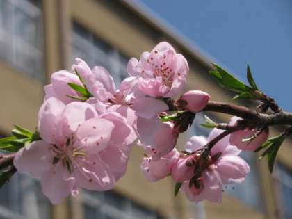 桃山小学校のシンボルツリーの「桃」も濃いピンクの花びらがしっかり開いてきました。