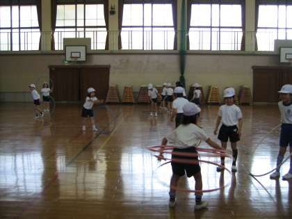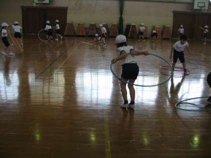 体育舘での体育は,用具を使って運動しています。フラフープを使ったところ,たくさんの人が,上手に腰でまわせるので驚きました。その他にも,なわとびのようにまわしたりブーメランのように投げて戻してみたりと色々な遊び方をしました。