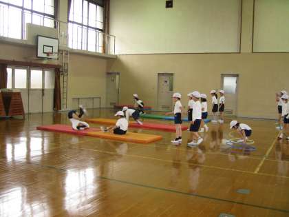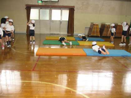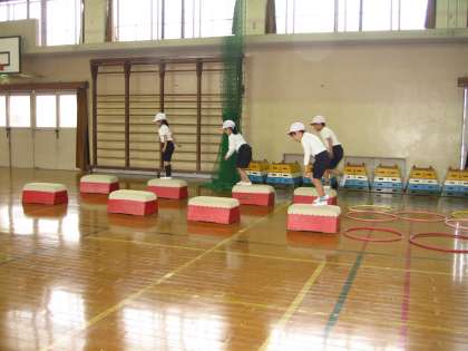 今日は,雨が降ったので,3クラス合同で体育舘で体育をしました。「用具遊び」の学習をしました。たくさんの人数なので,「サーキットあそび」と名づけてマットや跳び箱・フラフープなどを置いて順番に回ります。例えば,フラフープをけんぱで跳んだり縄跳びのように回して跳んだり,跳び箱を岩に見立てて跳んだり,マットで前回りや横に転がったりできるように場作りしました。子ども達は,回りながら色々な運動をしました。