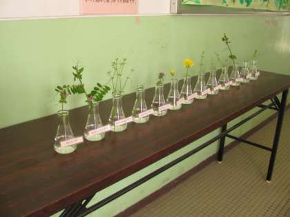 北校舎の入り口に校内で見つけた野花が飾られています。