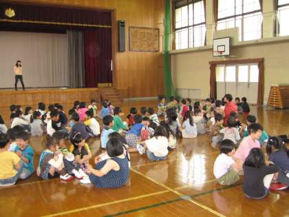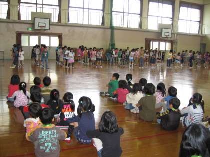 今日は,「1年生と2年生とがなかよくする会」をしました。実行委員を各クラス2名ずつたてて,運営してもらいました。実行委員になりたくて立候補する人がたくさんいました。うれしいことです。選ばれると,休み時間に練習です。その練習のかいがあって,「なかよくする会」は大成功!1年生に喜んでもらえました。2年生もけん玉を披露したり,「なかまあつめゲーム」を楽しみました。