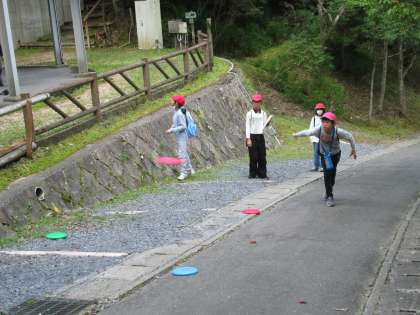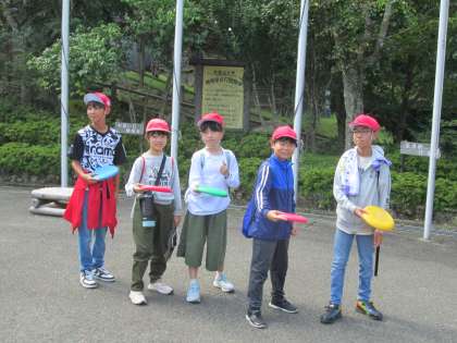 本日の活動1つ目は「フライングディスクゴルフ」です。その名の通り、フライングディスクをゴルフの要領でゴールに入れていく遊びです。
