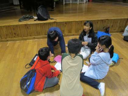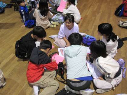 今日の最後は係と班での振り返りです。オリエンテーションホールで行いました。