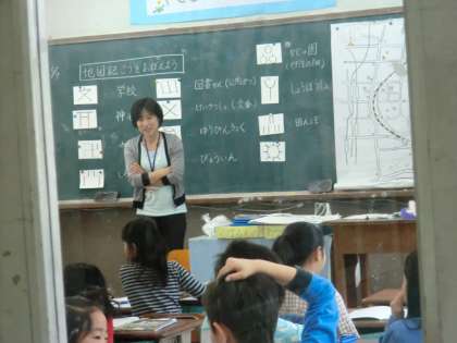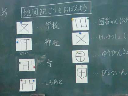 前回の授業では自分たちで地図をつくり,それを張り合わせて校区地図をつくっていましたが,それぞれが自由な書き方だったため何か共通する記号を・・・ということで今日は地図記号を学習しました。学校や郵便局などは知っている人も多かったのですが,そのほかにも工場や警察署,消防署など初めて知る記号もたくさんありました。また,田んぼや畑も記号で表すことを知り,それを使って校区地図に表していきました。