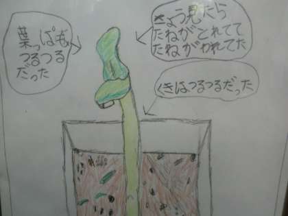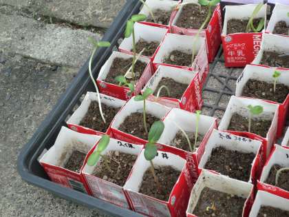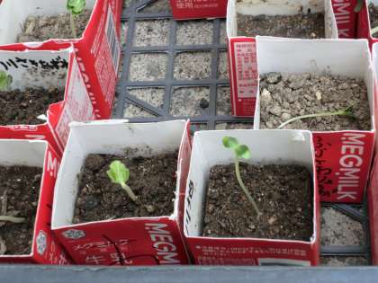 3年生の理科で連休前に植えたひまわり,ほうせんか,オクラの種が発芽しました。ひとりひとりの牛乳パックからかわいい芽がしっかり顔を出しています。双葉が開いていないものもありますが,さっそく観察をしました。