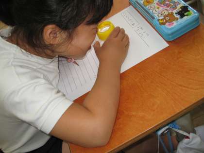今年の生活科では,ミニトマトを育てます。今日はそのミニトマトの種を観察しました。朝顔の種と違ってミニトマトの種はとても小さいです。あまりの小ささに驚いていた子ども達です。虫眼鏡を使って拡大して観察しました。しっかり見ながら「見つけたよカード」に書いていた子ども達です。