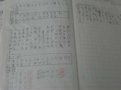 少し慣れてきた割り算,「九九に答えのない割り算」の学習です。学習問題に対し自分の考えをノートに書いていきます。頭の中で考え,文章にしていくことで更に考えが深まります。意見交流も書き留めたことを基にしているので活発に行われているのでしょう。