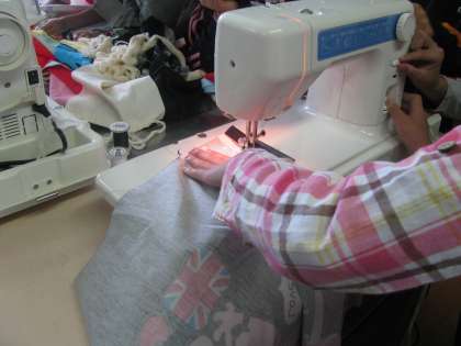 しつけを終えた子ども達。今日からいよいよミシンを使い始めました。