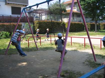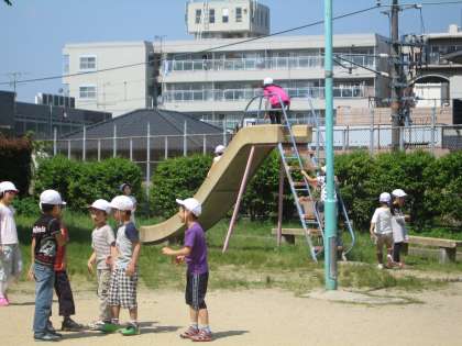 桃山小学校の校区のすてきなところを探しに,町探検に行きました。まずは緑コースを歩きました。福島児童公園では,休憩がてら遊びました。すべり台やシーソー・ぶらんこ・うんていなど遊具がたくさんあります。福島児童公園で遊ぶのが初めてだった人もたくさんいて大喜びでした。すてきな公園を見つけることができました。