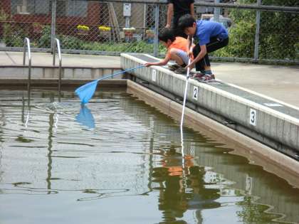 今日はプールへやごを探しに行きました。やごはプールの壁側にくっついていることが多いという説明を聞き,虫捕り網をプールにつっこみ一生懸命探しました。