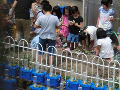 牛乳パックを苗床にしていたひまわり・オクラ・ほうせんかの苗が大きくなってきたので学年の畑に植え替えをしました。根っこごとそっと取り出して土にそっと植えました。しっかり根を下ろしてぐんぐん成長してくれることを願い,毎日の水やりをがんばります。