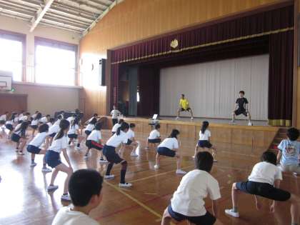 小学校生活最後の運動会,「心に残る素晴らしいものに,子どもたちの輝く姿を!」と団体演技「組体操」の前に「ロックソーラン」を踊ります。さっそく,股を割り、腰をおとして練習開始です。1.2.3.4・・・心を一つにして頑張ります。