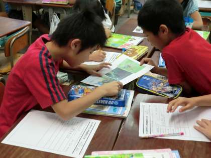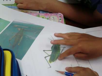 今日はトンボとバッタの体のつくりを資料をもとにグループでまとめる学習をすすめていました。あしやはねの数,口やしょっかくの場所や形など友だちと確認しあいながら表に書き込んでいきます。