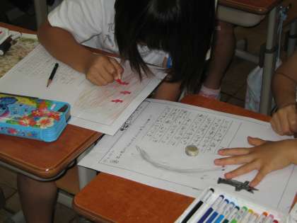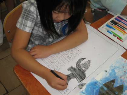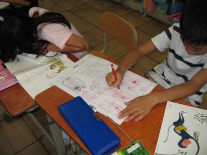 国語の授業は,「スイミー」に入りました。とてもすてきなお話で子ども達は楽しそうです。「スイミーという名前からどんなことを連想しますか。」という発問に「泳ぎが速そう。すいすい泳げるみたい。」「かしこそうな感じがするね。」などと想像がふくらみます。初めて読んだ後,どの場面がこころに残ったかプリントに書きました。