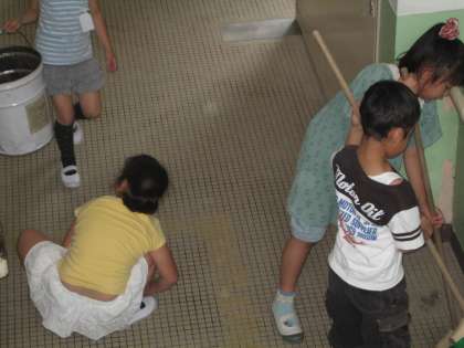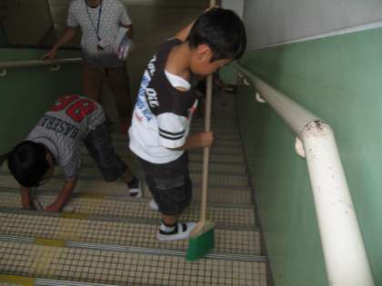 運動場が雨で湿っていて運動靴の底に土がつきます。階段掃除はこんな日には大変です。はいてもはいても土が残りなかなかきれいになりません。そこで何度もほうきではきます。そのあとは力を入れて雑巾がけをします。でも,苦労のかいあってぴかぴかになりました。「ああ。腰が痛くなったわ。」とつぶやいていた子ども達でした。
