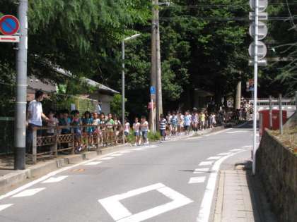 加えて,今年は,坂の下へ避難した後,他学年と合流するため,迂回して通用門から運動場へと戻る歩行訓練もしました。