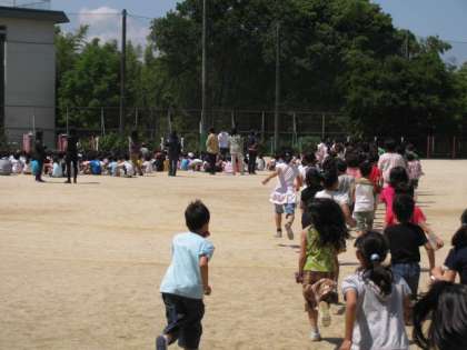 8分後,担任団に誘導されて整然と学校へと戻ってきて,先に避難を完了している学年と合流することができました。