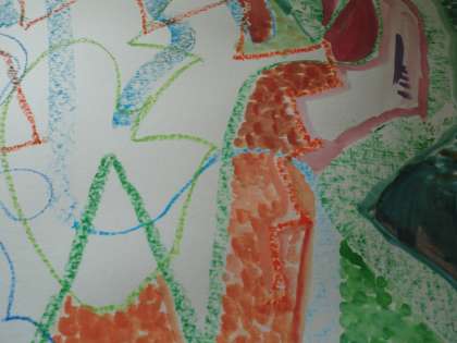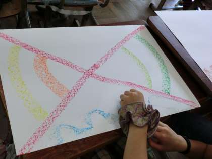 その後,絵の具で好きな色をつくり線と線の間にいろんなぬり方で色をつけていきます。パスの線の上をぬるので絵の具がはじいてきれいです。