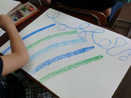 自分のすきな色のパスで思い思いのひとふでがきをしました。くねくね曲がった線,パスを横向けに倒した太い線,カラフルな線が画用紙いっぱいに広がりました。