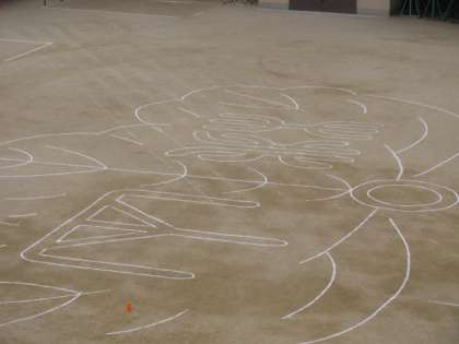 この後,9時45分ごろから外に出て,色画用紙を持って,きめられたラインの上に整列します。