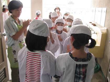給食を大切にしたいと考え,学校にいるときはサービスホールで給食当番の子どもたちを出迎えることにしています。