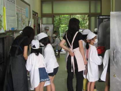 今日も,桃山小学校の子どもたちは,マスク,白衣をきちんと身につけて,担任と一緒に並んで給食を取りにきました。