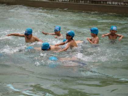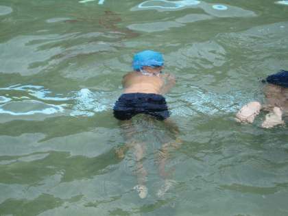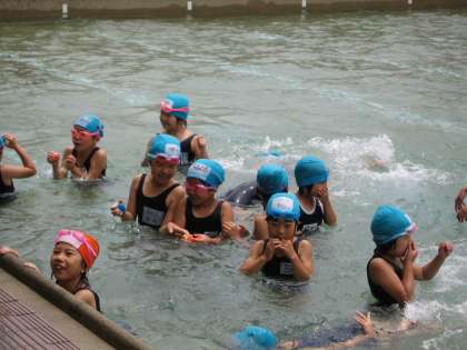 最後は,ごいし拾いをしました。底に沈んだごいしをもぐって拾います。顔つけの苦手な人もこれだとゲーム感覚でつけられます。遊びを入れながら水なれをしているところです。