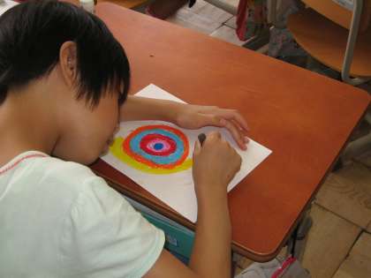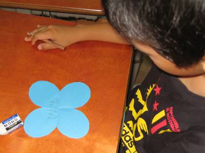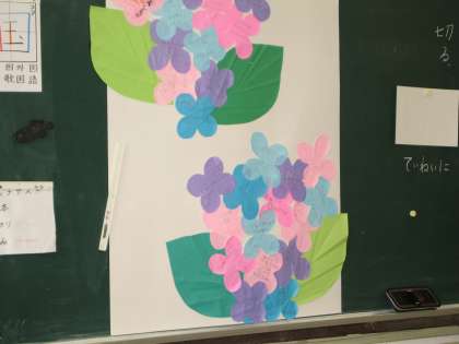 呉竹総合支援学校との交流として来週「6月のつどい」があります。そのとき掲示するあじさいの花作りをしました。あじさいの花びらに楽しく学校生活を送るために自分がしようと思うことを書きました。「なかよくあそぼう。」「困っている友達にやさしく声かけしよう。」など思っていることを書いていた子ども達です。