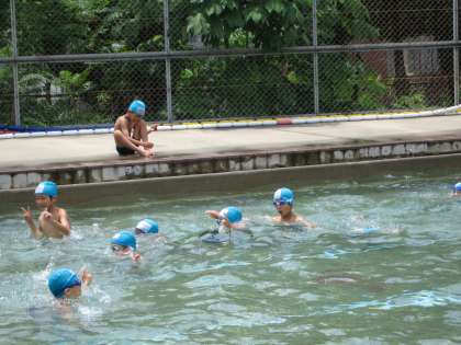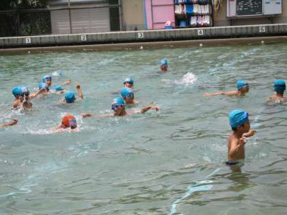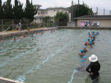 今日もお天気に恵まれて,体育でプールに入れました。少し水温は低かったけれど,子ども達は大喜び!ずいぶん浮けるようになってきました。バタ足の練習はビート板なしでしました。少しずつ距離が伸びていますね。ひざを伸ばして泳げるようにがんばっている子ども達です。