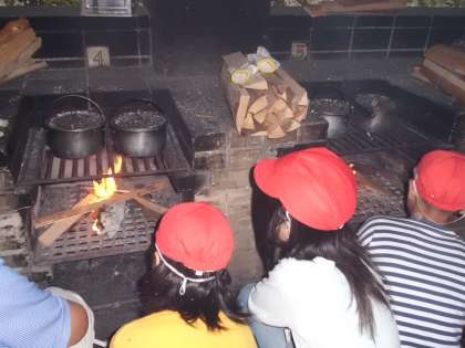 材料が切れたら,おなべをかまどにかけて,煮込みました。