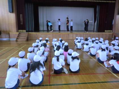 3・4時間目に京炎そでふれの練習が始まりました。京都学園祭典の大学生の先生に教えていただきました。基本の動きを確認したり,流れを1つ1つ確認しながら踊りました。