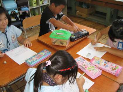 生活科の時間では,「いきものはかせになろう」ということで教室に持って来てくれたり探してくれたりした生き物を観察しています。かたつむりやばった・かまきり・くわがた・ごみむしなど7種類の生き物がいます。それをじっくりと観察して,見つけたよカードにかきました。熱心に取り組んでいた子ども達です。