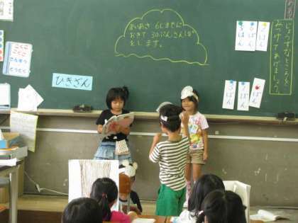 1年生の教室では,国語「おむすびころりん」の音読発表会をしていました。