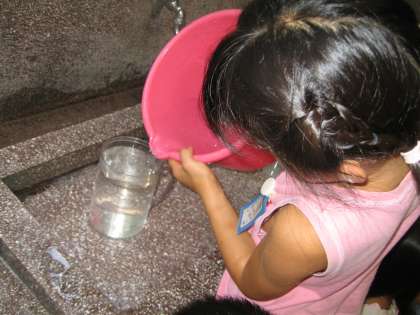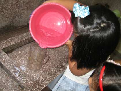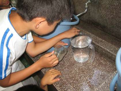 「今日からかさの学習をします。」と言うと「えっ傘の勉強するの?」に大笑い。なごやかにスタートしました。バケツの水を1リットルますで量ります。暑いこともあって水をさわれるので喜んで量っていました。「3杯だから3リットルだね。」などと言いながら確かめていました。