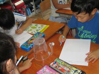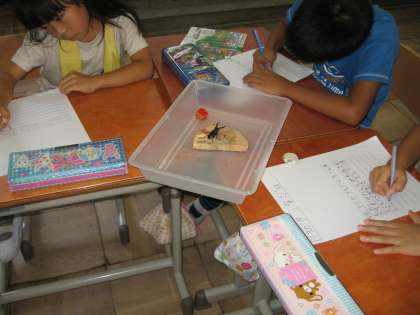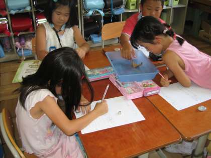今日の生活科の授業では,教室にいる生き物を観察して見つけたよカードに書きました。この前に観察した生き物とちがう生き物を観察しました。2回目なので体の仕組みをしっかり観察するようにこえかけしました。例えば体がわかれているようならばいくつにわかれているか,足は何本あるか,どんなところから足がでているかなどをじっくり観察してもらいました。自然と生き物の図鑑を片手に興味深げに観察していた子ども達です。