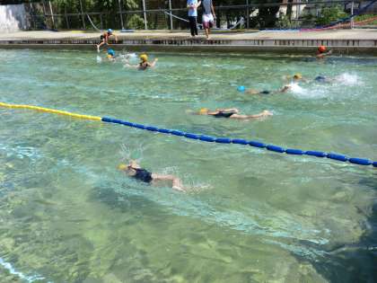 最後はお楽しみの自由水泳。ロングビート板にのったりつかまったりして歓声をあげながら水遊びを楽しみました。