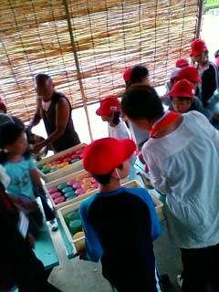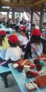 あずまやで夕食をいただきます。今日はお弁当です。食事係も,お茶の準備を頑張っています。