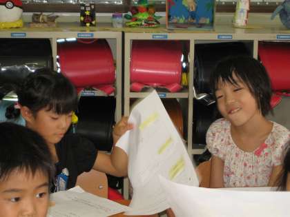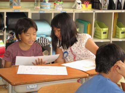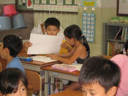 国語の授業では,「あったらいいもの」を考えて二人組で話し合いをしました。「もう少しくわしく話したほうがいいよ。」「うん。いいね。ちゃんとわかるよ。」などと感想を言い合いました。そのアドバイスを参考に発表原稿を書きます。