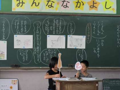 首が長くて上手にどんぐりを拾えず悲しんでいるキリンに,「自分たちが拾ったどんぐりで首飾りを作ろう」とやさしく声をかけるうさぎやりすの気持ちをペープサートを使ってお話しました。