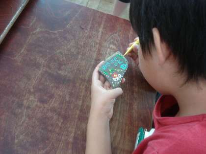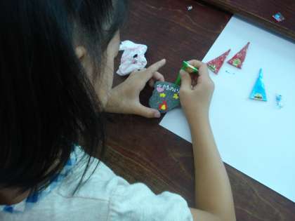 みさきの家で拾ってきた石に,思い出をカラーテックスで描いていきます。