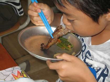 今日の給食は,麦ご飯とさばのしょうが煮・三度豆のごま煮・味噌汁牛乳でした。体育でおなかを空かせた子ども達は給食を早く食べたくってとても楽しみにしていました。魚も上手に食べられるようになりましたね。骨までやわらかく煮てあるので,ぺろりと食べていました。「この麦ご飯もおいしい!おかわりしよう。」とおかわりする子ども達。好き嫌いなくよく食べています。