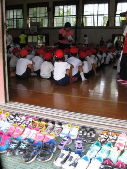 担当の教員の指示にそって整然と集合している態度が立派でした。とりわけ体育館入口に脱がれた靴がきちんと揃って並んでいたのにもとても感心しました。