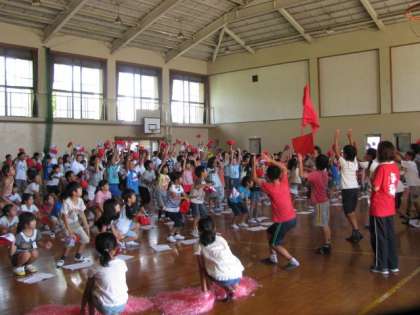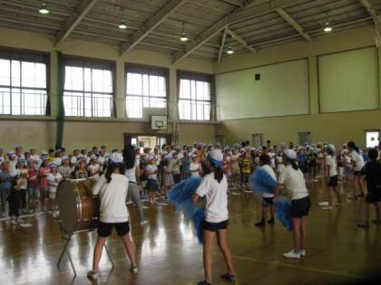 大きな声でかけ声をかけたり,帽子を振ったり,みんなとても熱心に取り組んでいます。