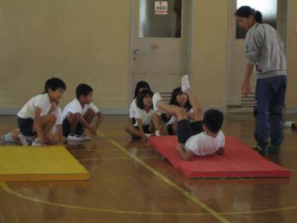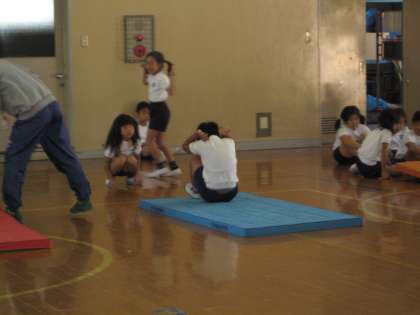今日の体育はマット遊びの3時間目でした。前転はずいぶん上手にまわれるようになりました。そこで今回は後転の練習もしました。背中を丸くしてひざを体から離さないようにまわります。両手で自分の体重を支えることができない人がいます。いきおいをつけてまわらなければうまくまわれません。明日も後転を中心に学習していきます。