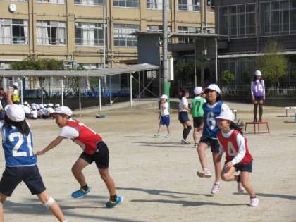 うららかな日差しを浴びて,とても楽しそうにゲームに興じています。ともすれば勝敗にこだわりやすくなるボールゲームですが,声を掛け合いながらとてもなかよく気持ちの良い態度でプレーしており,日ごろの友達関係が円滑に結べている様子が伝わってきました。