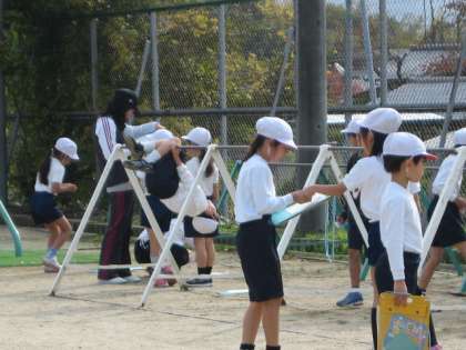 今日の体育は,1組と2組はパスゲームでした。まだお天気もよく初めは寒くてトレーナーを着ていた人も暑くって脱いでゲームをしていました。今夜から寒くなるようです。風邪をひかないように気をつけてくださいね。3組は鉄棒でした。鉄棒のがんばりカードを見ながら挑戦していました。明日も体育があるのですが,お天気はどうでしょうね。