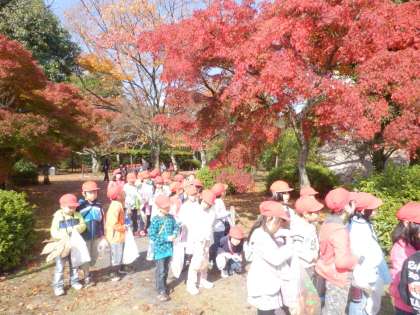 お城の庭には,赤や黄色になって落ちているきれいな葉っぱがたくさんで,じゅうたんをしいたようでした。お目当てのどんぐりもいっぱいです。1年のみんなはもう夢中で,もみじや桜の葉や,まつぼっくりなど木の実もたくさん拾いました。