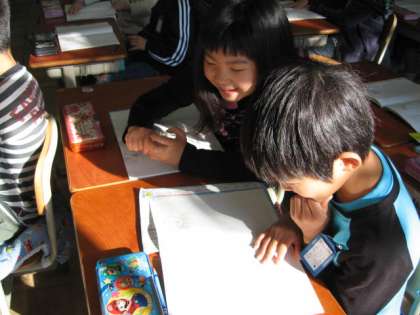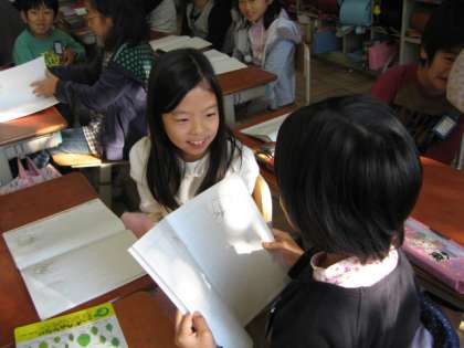 国語では,「しかけカードの作り方」を学習しています。今日は挿絵をノートに貼って,それを見ながら,隣り同士で説明をしあいました。相手にわかってもらうためのわかりやすい説明はなかなか難しいです。接続語をつかいながら説明していた子ども達です。実生活でも相手にわかる説明をする力をつけることは大切ですね。いい学習ですね。