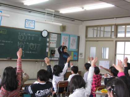 4年生では,算数で「等しい分数」について学んでいました。分母と分子を同じ数でかけるともとの分数と等しい分数が作れるということが分かり,たくさんの手が挙がっていました。熱心に学んでいますね。