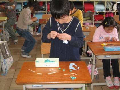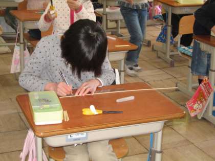 算数では,「はこのかたち」の学習をしています。面や辺・頂点などの用語をおしえました。そして,工作用紙を使って面の形を切り抜き,はこを作ったり,竹ひごを切って粘土玉を作りはこの形を作ったりしました。頭だけで考えるのでなく,体験を通して考えていきます。「まるで,図工みたいだね。」なんて言いながら楽しそうに作っていた子ども達でした。